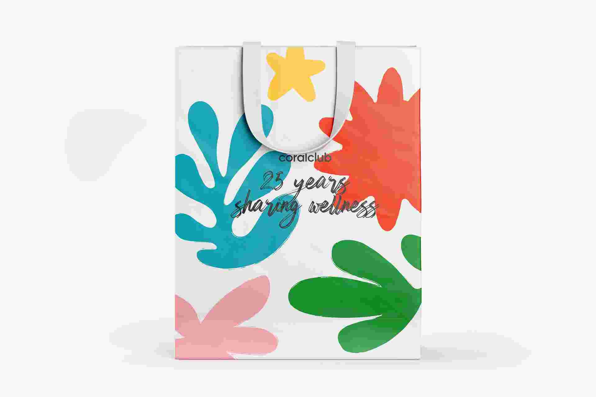 שקית מתנה ממותגת שמוקדשת לחגיגות ה-25 של Coral Club. העטיפה המושלמת למתנות שמשמחות את הקרובים שלכם ועוזרות לשמור על הבריאות.
