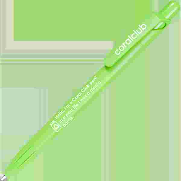 עט כדורי עם מנגנון לחיצה מחומר PET-RECYCLED עם כיתוב ״היי, אני העט של Coral Club! בחיי הקודמים הייתי בקבוק פלסטיק״.